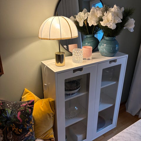 Vit tv bänk från Asplund med tre sektioner. Varsamt användlite skada kant - se kort.