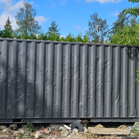 Isolering i tak, väggar och golv. Elanslutningar: 400V/32A. Ventilation: Reglerbar mekanisk ventilation ovanför varje fönster. Fläkt med ljuddmämpare att montera på utsidan styrd från vridpotentiometer / dimmer ingår. Jalusi för fönster. Dimensioner : 6055 × 2435 mm 20 ft container Från Kontorsboden. Använts på ett och samma ställe i ca 15 år. Hyllor längs vägg ingår om man vill. Luftvärmepump och entre-tak ingår. Transport kan ordnas mot självkostnad. Länk till motsvarande ny idag https://www.bodborsen.se/produkt/kontorsmodul-20fot-bla-2/