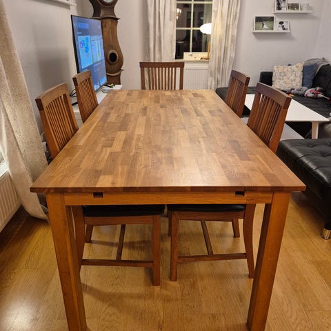 Matbord 230 × 100 cm + 8 stolar (kan bli 6-sits)