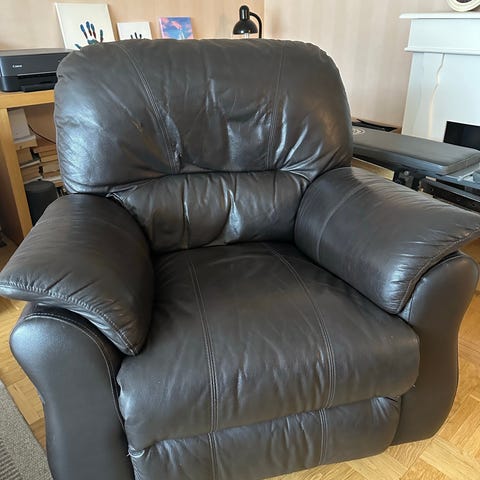 Fåtölj i svart skinn med reglerbart ryggstöd och tillhörande fotpall. Nypris 14000 kr. Nu 7799 kr. I mycket gott skick.