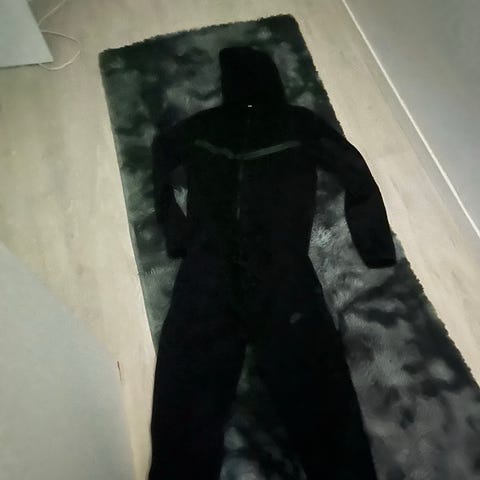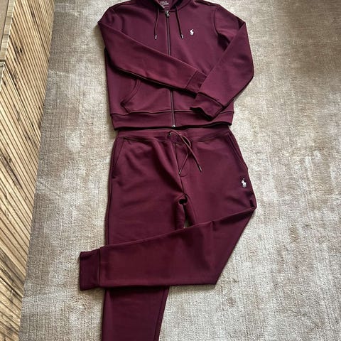 Nike träningsset i röd färg för herrar, storlek L. Setet består av en huvtröja med dragkedja och matchande byxor med dragsko i midjan.