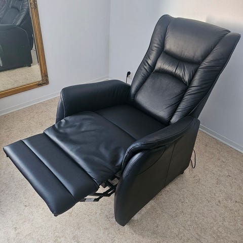Reclinerfåtölj med ställbart rygg- och fotstöd, lyfthjälp och lättmanövrerad fjärrkontroll. Allt fungerar perfekt.