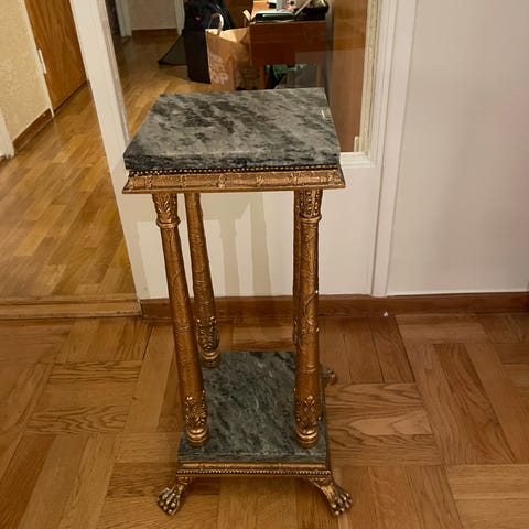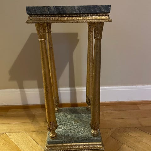 2 st piedestaler på träben i guldfärg.Marmor platta ovanpå. Mått: 1. H 89 cm B 26 x 25 cm