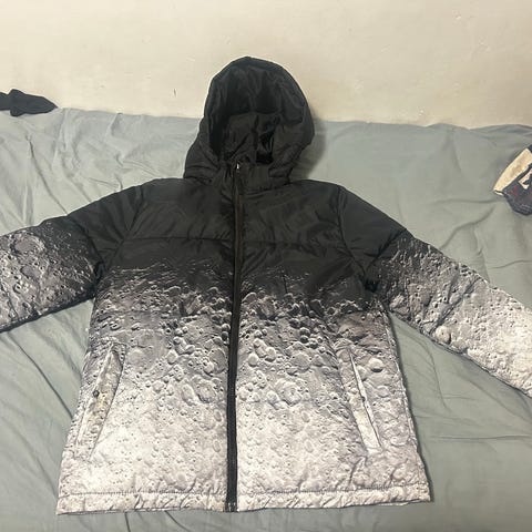 Eddie Bauer jacka i storlek M för kvinnor. Jackan är blå och har en vadderad design med dragkedja framtill. Den är lämpad för användning som ytterplagg vid kyligare väder.
