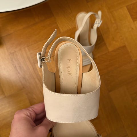 Zara klackskor i storlek 39 med brun färg. Skorna har en kilklack med flätad design och spänne vid ankeln för justerbar passform. Materialet är läderliknande och de är öppna framtill. Så gott som nya.
