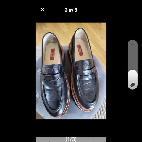Finskor i storlek 40 med svart och vit färg. Skorna har en rem över vristen och en klack. Yttersula i svart material. Passar för finevent men även lugnare evenemang.
