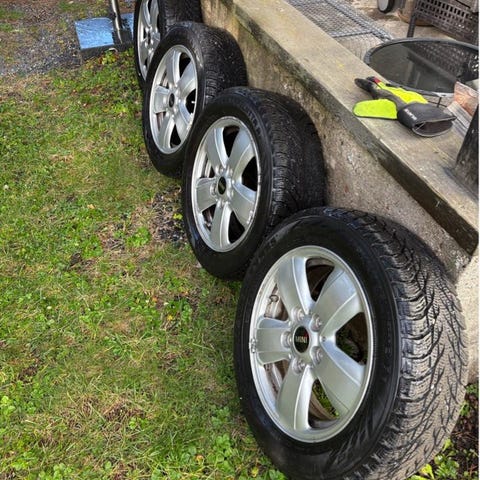 Mini originalfälgar i bra skick, men med några mindre skador, se bilder. Perfekt för att byta ut gamla tråkiga plåtfälgar till vinterdäcken!