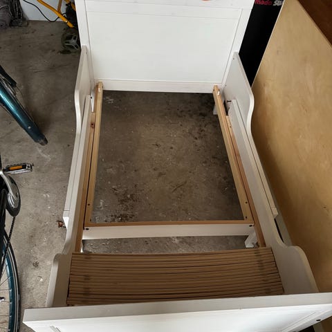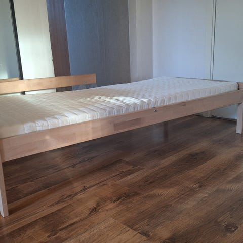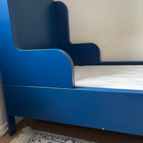 Barnsäng Kritter från IKEA med ribbotten, stödbräda, madrass och vätsketätt madrasskydd. Bäddmått 70x160 cm. Yttermått 75x165 cm. Allt i fint och rent skick.
