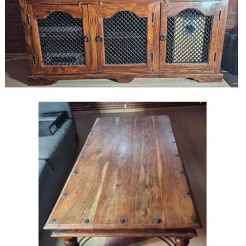 Skänk i trä med två lådor och dubbeldörrar i varm gul färg. Skänken har dekorativa detaljer på sidorna och metallhandtag.