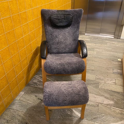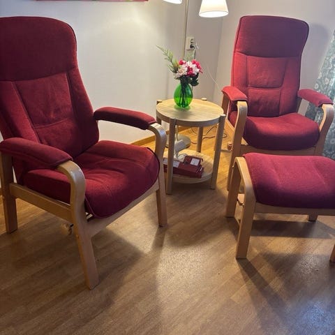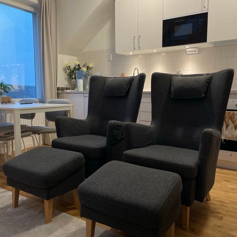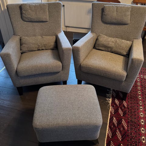 Två smäckra och högst komfortabla, roterbara fåtöljer Moore (höga modellen). Tillverkad av svenska Conform (i Småland) med matchande fotpall, reglerbara nackstöd samt tillhörande, tvättbara stolsskydd i fårskinn. Fåtölj och pall i cognacsläder, metallarbetet i aluminium och gråtonade fårskinn. Fårskinnen levererades tillsammans med övrigt och har varit på sedan dag ett varför slitaget på fåtöljerna är minimalt. Allt sparsamt använt, underhållet med lädertvätt och inköpt på Mio Möbler i Linköping.