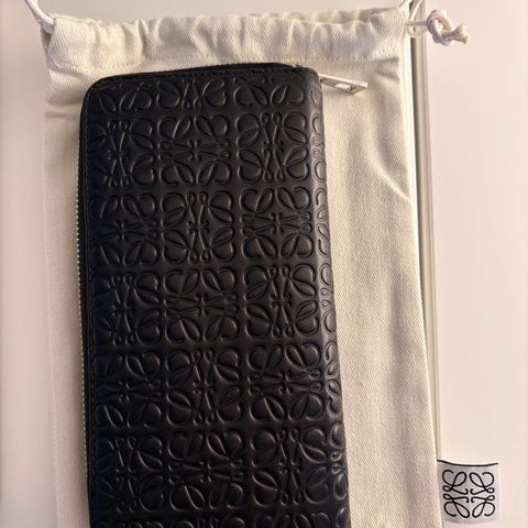 Loewe plånbok i läder i flera färger. Designad för unisex-användning. Plånboken har flera kortfack och en dragkedja för förvaring av mynt och sedlar. Levereras med originalförpackning och skyddspåse.