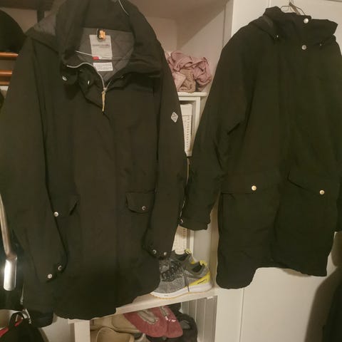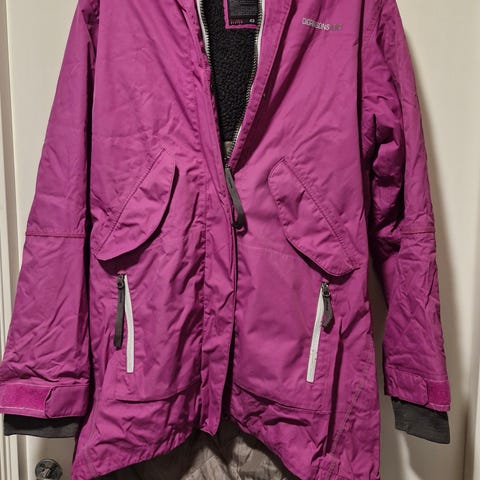 Säljs då den inte kommer till användning, endast använd 1 gång. Didrikson Saga stl 42. Djur och rökfritt hem. Sidoslitsar med knappar,omlottluva,dragsko och fickor.