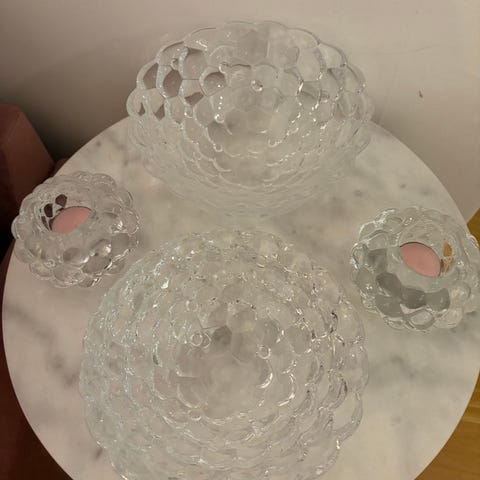 Fyra skålar i glas modell Eden av Orrefors. Former är ett löv. Tre större skålar. Ca 21 cm i diameter. 10 cm hög. En mindre skål. 17x12 cm. 5,5 cm hög. Inga skador eller märken.