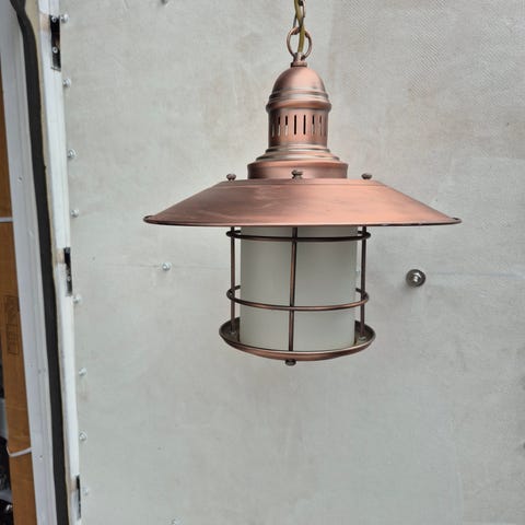 Fin antik vagnslykta i koppar, aldrig använd utomhus, gammal familjeklenod fr. förra sekelskiftet som alltid hängt på väggen hemma på gården i alla år. Elektrifierad i efterhand. Ljusgröntonat handblåst glas. Komplett med armatur, sockel för E 27 lampa, sladd och 230 volts stickkontakt. Glödlampa medföljer ej. Mått höjd 46 cm, bredd 12 cm.