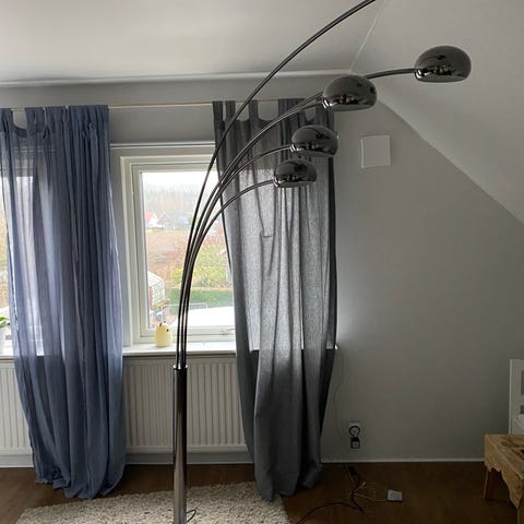 5 armad golvlampa. Med marmorfot och silvriga armar och lampkåpor. Går att ställa in olika ljuslägen. 1 lampa har gått i sönder i kåpan. Går troligtvis att limma fast den. Lampan och strömmen fungerar.