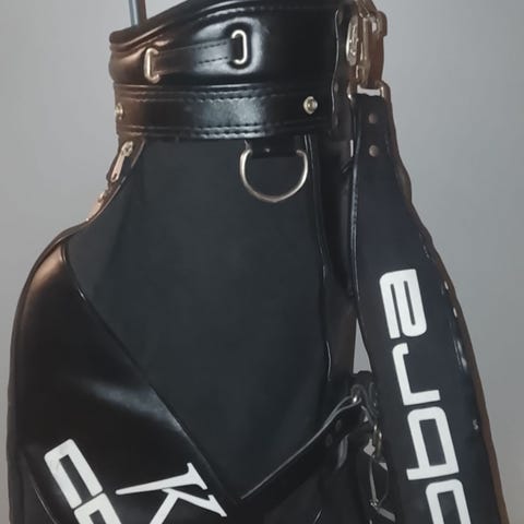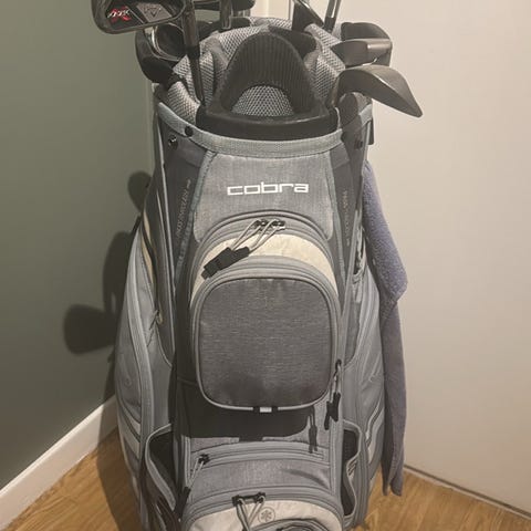 Cobra golfbag med flera fack för förvaring. Golfbagen är grå med röda detaljer och har en uppdelad topp för att organisera golfklubbor. Den är utrustad med bärrem för enkel transport.