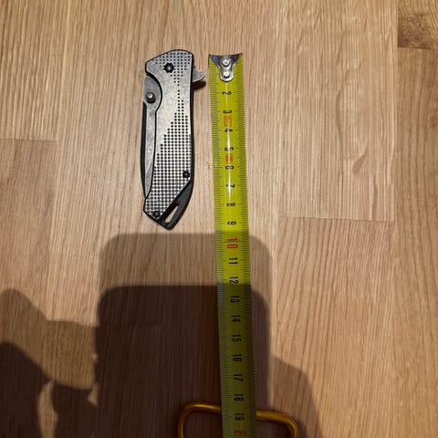 Säkerhetsanordning Knivbladets längd är cirka 8 cm och total längd när öppen är cirka 16cm. Kniven har en metallklämma för fäste och ett svart handtag med textur för bättre grepp.