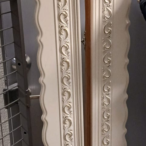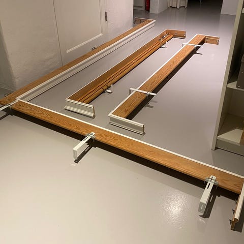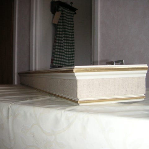 50-60tals kornisch i bra skick med spår för dubbel upphängning, 180cm långa, 14 cm djupa. Original väggfästen, original gardin upphängning och ett antal vintage gardiner, 2 till varje kornisch ingår.