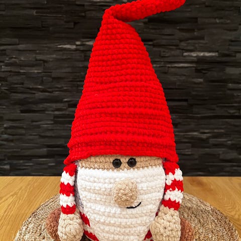 Jag säljer en unik, handvirkade tomte gjord i mjukt och glänsande sammetsgarn. Tomten är ca 50 cm hög och är ett riktigt blickfång i julmyset.