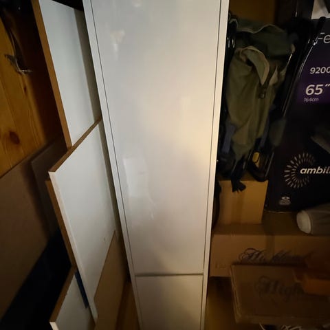 Ett mörkgrått badrumsskåp som inte får plats nu när vi satt in tvättmaskin!
