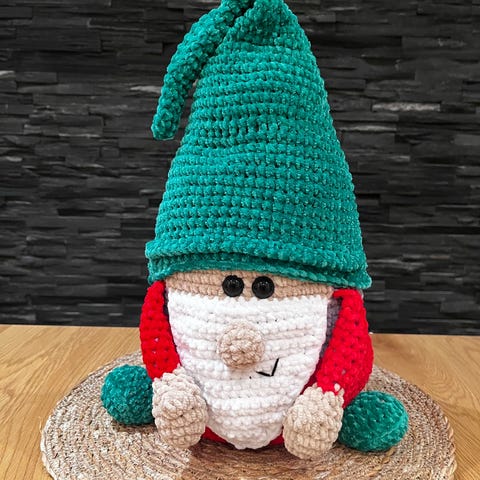 Jag säljer en unik, handvirkade tomte gjord i mjukt och glänsande sammetsgarn. Tomten är ca 45 cm hög och är ett riktigt blickfång i julmyset.