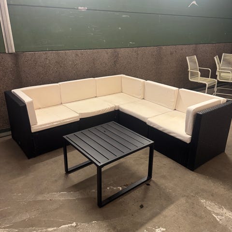 Utemöbel i form av en hörnsoffa tillverkad i grå konstrotting. Soffan har ljusgrå dynor för sittkomfort plus medföljande bord.