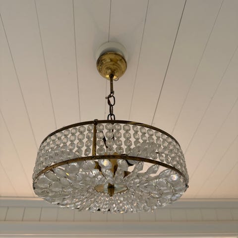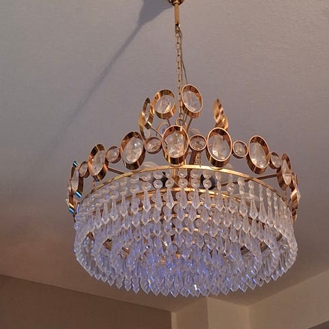 Mycket pampig kristallkrona. Höjd 90 och bredd 70 cm. Finns i Säffle.