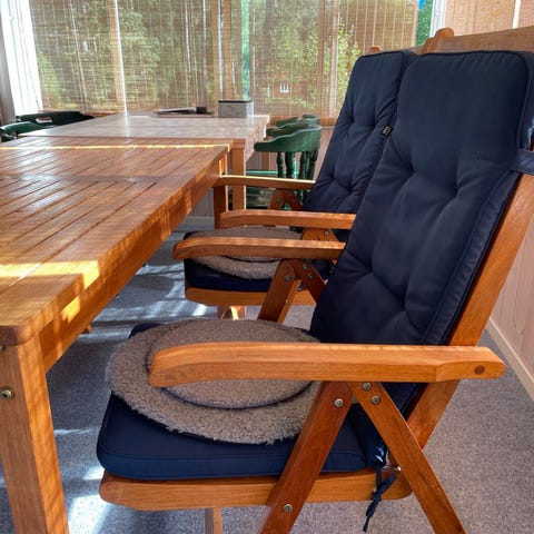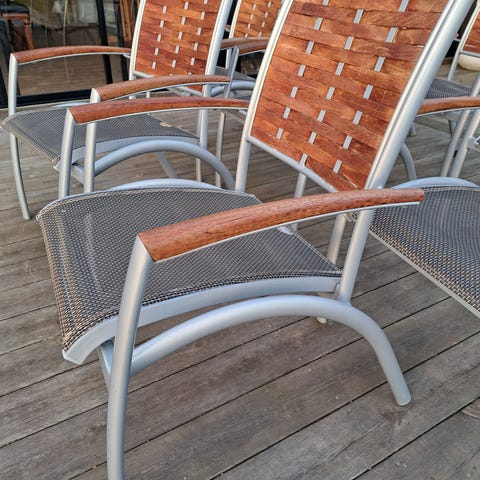 Utemöbelset består av ett handgjort ekbord och sex stolar i en kombination av trä och aluminium.
