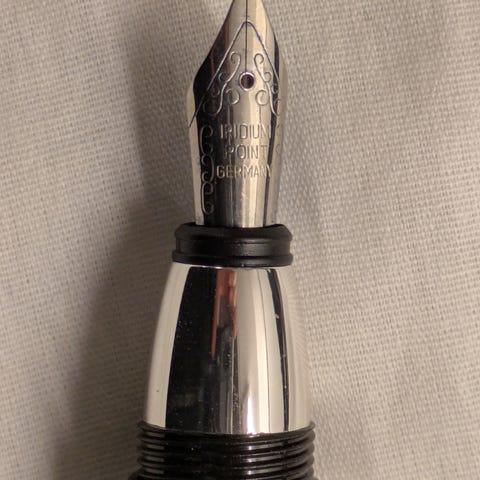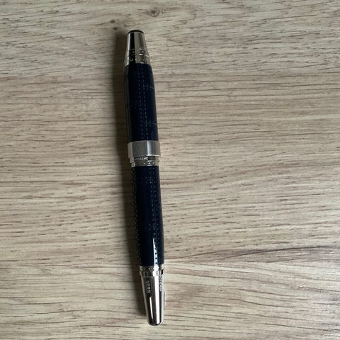 Pennan skriver idag i blått (kan ändras vid patronbyte). Finns annonsen kvar finns pennan till salu.