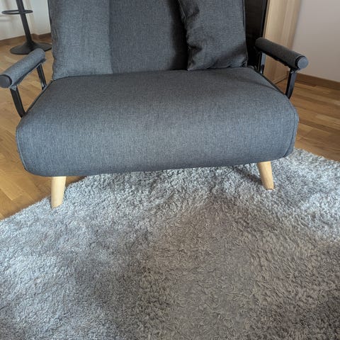 Blå bäddsoffa med armstöd och två matchande kuddar. Soffan med en höjd på 80 cm kan fällas ut till en säng som mäter cirka 190 cm i längd och 116 cm i bredd. Lämplig för både sittande och liggande användning.
