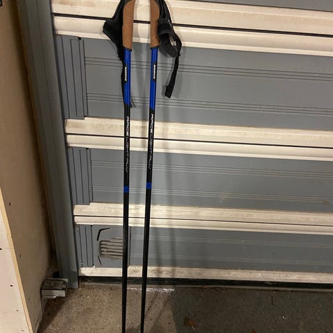 Lemmelin Active stavar för utomhusbruk. Stavarna är justerbara och har handtag med remmar. De är tillverkade av lätt material och är lämpliga för vandring eller promenader.