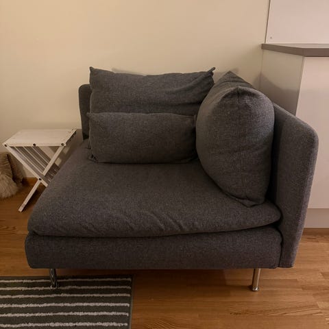 IKEA SÖDERHAMN hörnsoffa i vitt tyg. Mått: bredd 99 cm, djup 99 cm, höjd 66 cm, sittdjup 70 cm, sitsens höjd 40 cm. Soffan har avtagbara och tvättbara klädslar, metallben och lösa rygg- och sittkuddar.