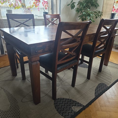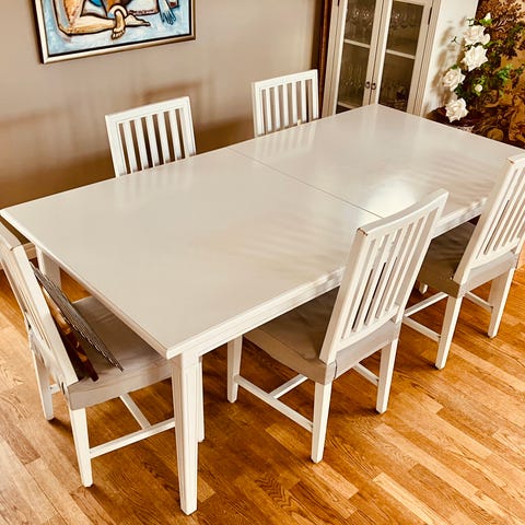 Paketet inkluderar bord samt iläggsskiva, 8 stycken stolar samt sideboard.