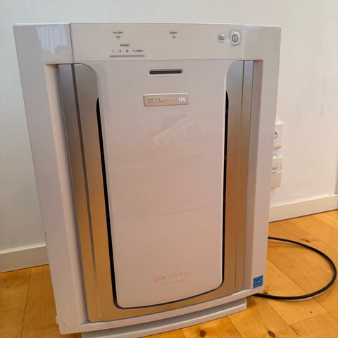 AI säger: Electrolux EAP450 Active Carbon luftrenare med kolfilter. Enhet med digital display och kontrollknapp för inställningar. Används för att förbättra luftkvaliteten genom att filtrera bort partiklar och lukter.