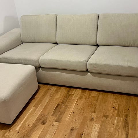 Grå 3-sits soffa med fotpall, 60x60x40 cm. Inköpt från Stalands för ca 5 år sedan.