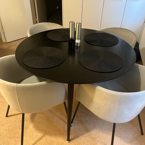 Mått för bordet: Höjd 75 cm, Diameter Ø 110 cm. Mått för stolarna: Höjd 85 cm, Bredd 44 cm, Djup 54 cm.