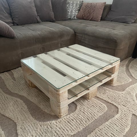 Egengjort soffbord som består av två ihopskruvade pallar som målats vitt och satt hjul på.