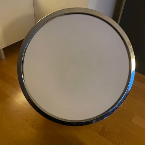 Skärm diameter 50 cm . Vitt linne men den inre plastbeläggningen är sprucken