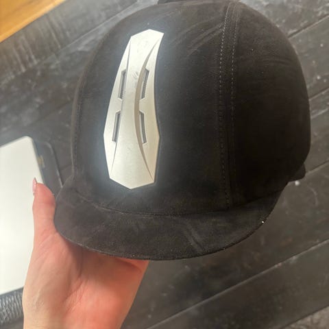 CRW Ridningshjälm i svart mocka. Hjälmen har ventilationsöppningar och justerbar rem för säker passform. Storlek 56.