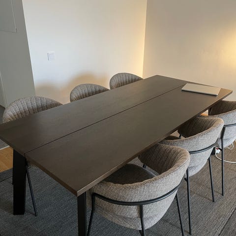 Med hjälp av två gömda iläggsskivor, som enkelt fälls ut, finns det sittplatser från sex till tolv personer runt matbordet. Bordet har en rektangulär form med en skarp kontur och sneda ben som ger en unik dimension.
