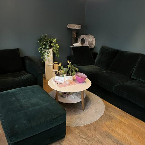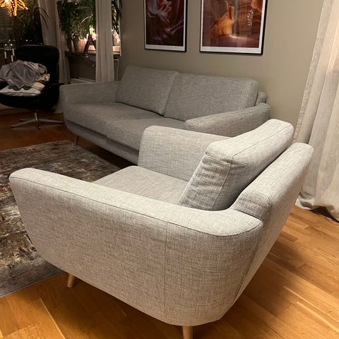 – 2 fåtöljer i gott skick – båda har inbyggd funktion där du kan trycka ut fotpallen samt luta bak ryggstödet för extra komfort.