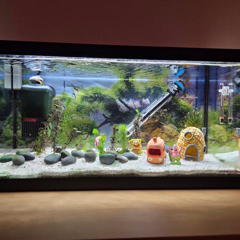 Det ingår även pump samt värmelampa och all inredning som syns på bild, även det som akvariet står på ingår.