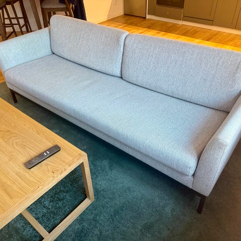 Och Soffan står i ett hobby-/sällskapsrum och används inte dagligen, så den är fräsch och inte söndersutten.