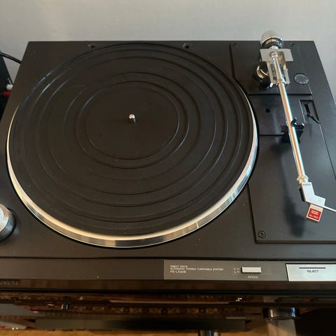 Sony PS-LX250H skivspelare med tillhörande högtalare. Svart färg och plastmaterial. Skivspelaren har en transparent skyddskåpa och är avsedd för uppspelning av vinylskivor. Högtalarna är svarta och matchar skivspelaren.