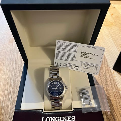 Klockan är lätt begagnad och väl omhändertagen. Normala, små spår av användning förekommer, men inget som stör helhetsintrycket. Glas och boett är i mycket fint skick. Gången är stabil och klockan fungerar som den ska. Jag har själv aldrig använt den och skulle estimera att den använts kanske 5-10 gånger. Läderbandet är i nästan nyskick.