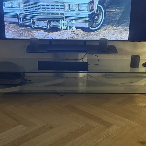 Säljer ett stabilt TV-bord i glas med metallram. Bordet står på hjul, men ett av hjulen rullar inte helt perfekt (kan enkelt bytas eller användas som det är).