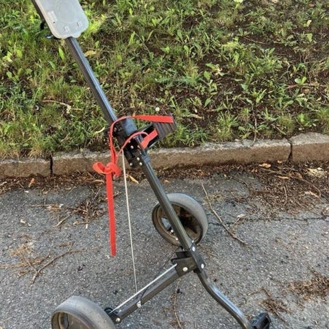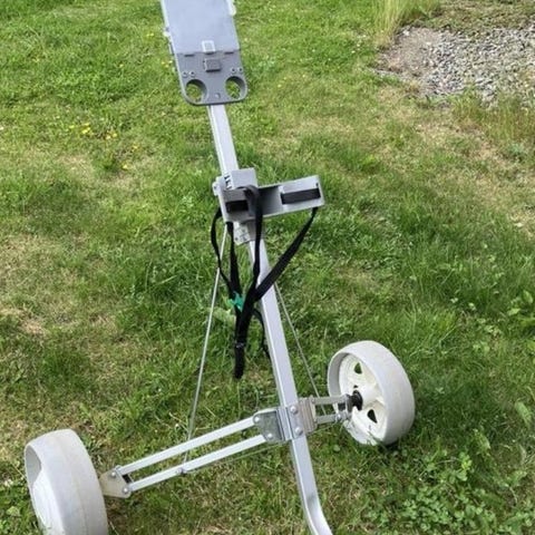 Bagboy golfvagn med tre hjul, svart ram och grå hjul. Utrustad med remmar för fastsättning av golfbag och handtag för styrning. Designad för att underlätta transport av golfutrustning på banan. Från Skottland , enligt på bilder finns i Västerås .