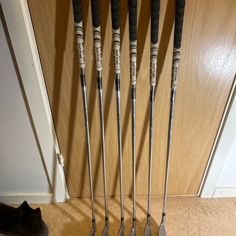 Setet är i gott skick med normalt bruksslitage, greppen är tejpade men känns pigga och har hållit ihop bra för mig. Tog mig från nybörjare ner till hcp 20 på under ett halvår ✅