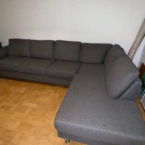 Finns 4 flyttbara nackstöd. Klädseln är avtagbar. Divanen är 140 cm, andra sidan är 235 cm. 1 pall som är 70cm.