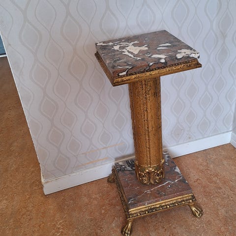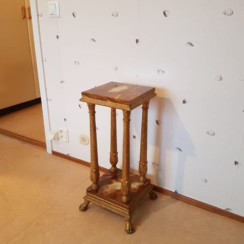 Säljer en vacker italiensk retro porslin pidestal från 70 talet. Den har en nästan osynlig liten skada på nedre delen den syns knappt jag har förstorat bilden för att den ska synas.Den är 72 cm hög